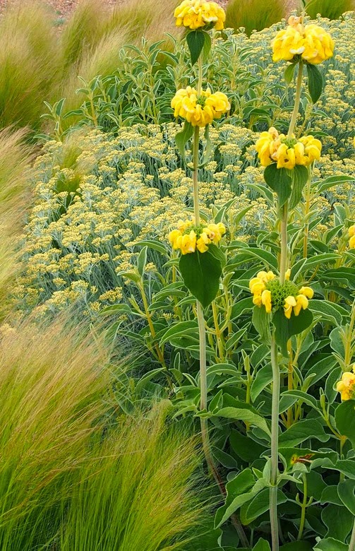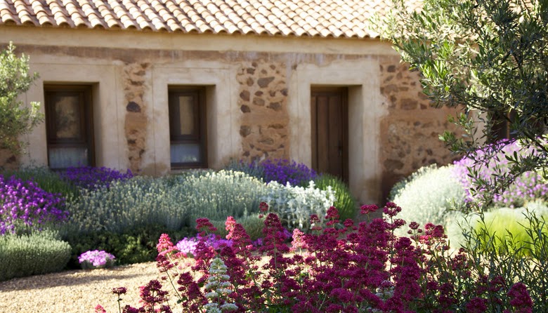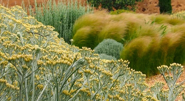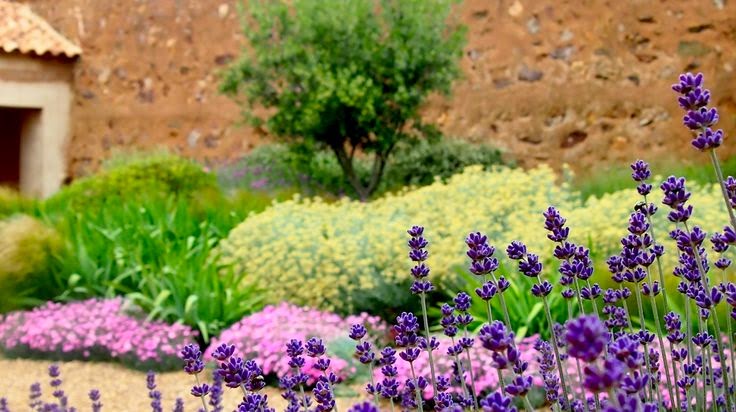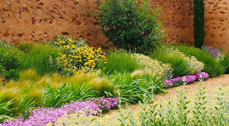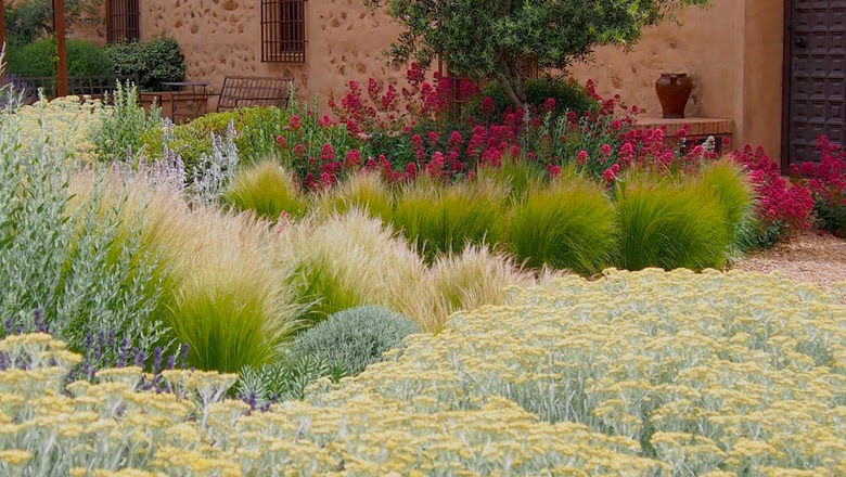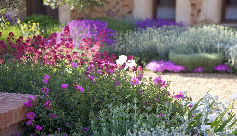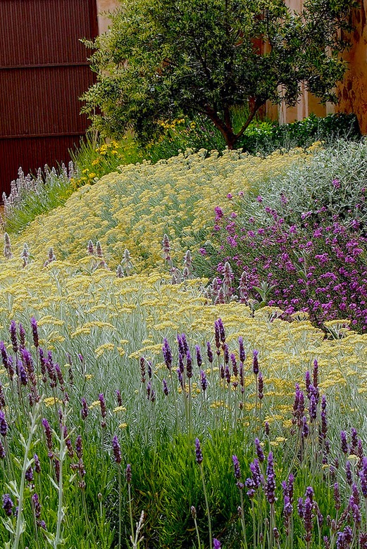 Buscaron especies a las que les gusta el suelo calcáreo y probaron con una mezcla mágica: Erisymum ‘Bowles Mauve’ (flor rosada) que utilizaban por primera vez; Euphorbia amigdaloides de flores amarillas y, entre otras especies de hoja gris como Teucrium, Helychrisum, Stachys, Perovskia, dos tipos de lavandas. Para dar movimiento la Stipa tenuissima que brilla acariciada por la luz del atardecer y el bello contraste rojo con Centranthus ruber.