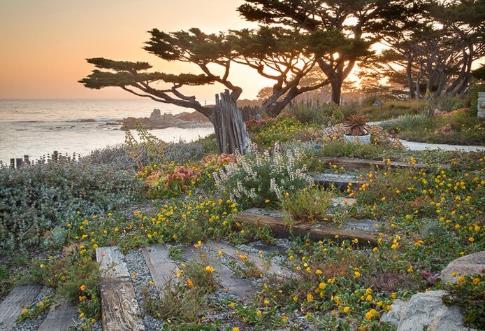 Árboles, plantas crasas, herbáceas, todo se prolonga. El Ceanothus nativo, junto con especies nativas de Carex, Salvia, Dudleya y Leymus se funden con el paisaje de la costa de California, en Carmel, para ser exactos. No hay trampa, hay arte, el de saber prestar ese hermoso paisaje costero, con lo que no solo se amplía el espacio ocupado por todas esa plantación, sino que se consigue embellecer aún más su puesta en escena.
