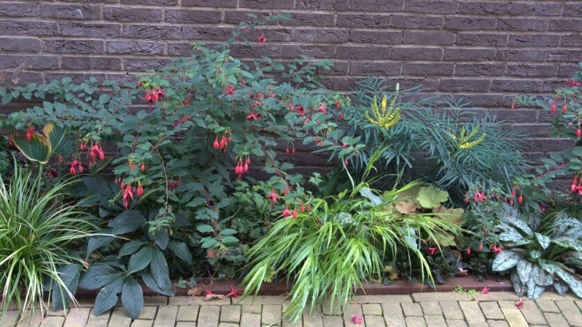 Jardín de fachada orientada al norte en Drie Pistolengang. Mahonia eurybracteata ‘Soft Caress’ flanqueada por Fuchsia ‘Mrs Popple’. En el primer plano, a la izquierda, césped caducifolio en invierno Haconechlea macra‘Allgold’ (sin raya central verde), además de Pulmonaria ‘Diana Claire’ Heuchera‘Caramel’, Ajuga reptans ‘ Black Scallop ‘, la compacta Fuchsia ‘Tom Thumb’, Pulmonaria ‘Opal’ y Alchemilla erythropoda.