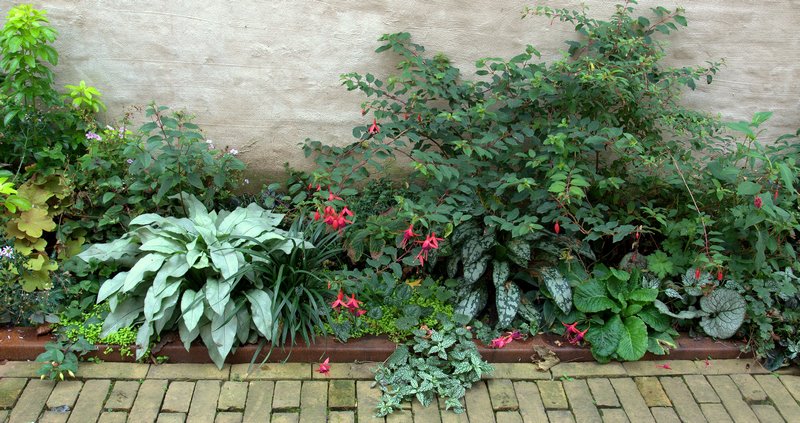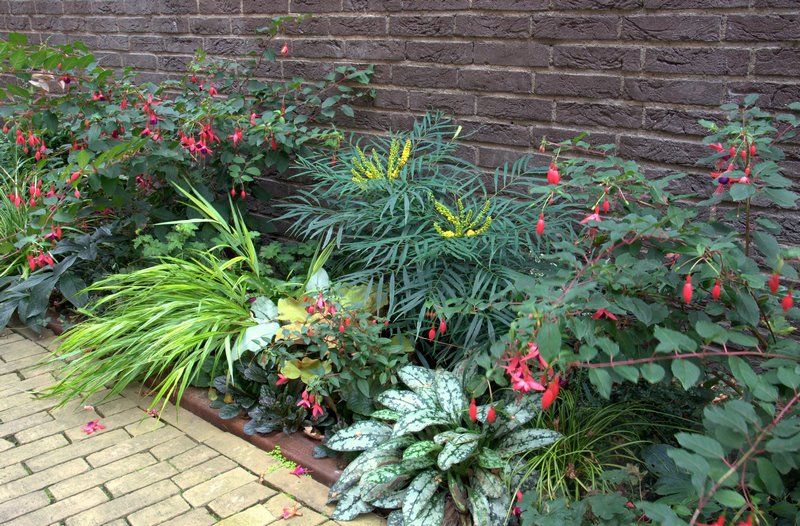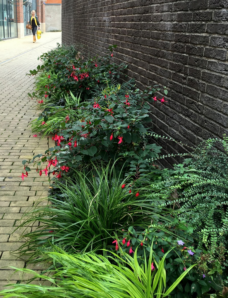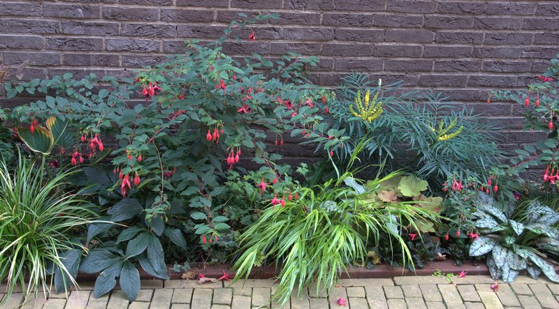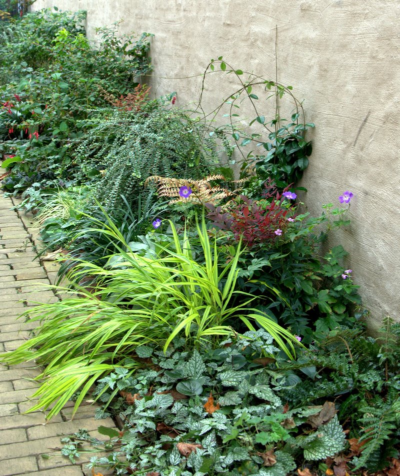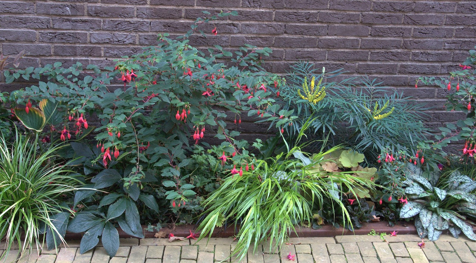 Jardín de fachada orientada al norte en Drie Pistolengang. Una colorida combinación que incluye una variedad de arbustos de hoja perenne, helechos y gramíneas, intercalados con varias fucsias resistentes al invierno, incluida la flor grande de Fuchsia ‘Mrs Popple’. A la derecha, contra la pared, crece la madreselva arbustiva Lonicera nitida ‘Baggesen’s Gold’. Las gramíneas ornamentales están representadas aquí por la juncia de hoja perenne Carex oximensis ‘Eversheen’ y la de hoja caduca Haconechlea macra ‘Aureola’, ambas con línea central verde. El geranio rosado en la parte frontal derecha es Geranium nodosum, que florece en la sombra y también lo hace bastante bien en algunos lugares más secos.