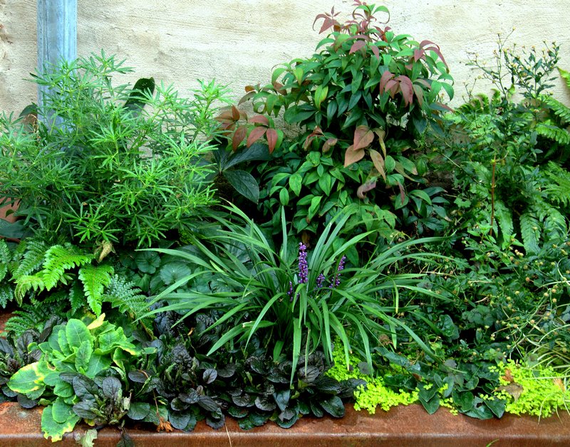 Primer plano del jardín de Pijpebakkersstraat en Het Eiland. Detrás de la placa de acero corten, entre otras especies, Choisya ‘White Dazzler’, delante, el helecho de borla Polystichum polyblepharum, y al principio Primula vulgaris, floreciendo al principio de la primavera, y las hojas oscuras y brillantes de Ajuga reptans ‘Black Scallop’; Cyclamen hederifolium y Soleirolia soleirolii ‘Aurea’. En el medio Nandina domestica ‘Obsessed’ y a la izquierda Helleborus hybrido y Liriope muscari ‘Moneymaker’ que comienza a florecer.