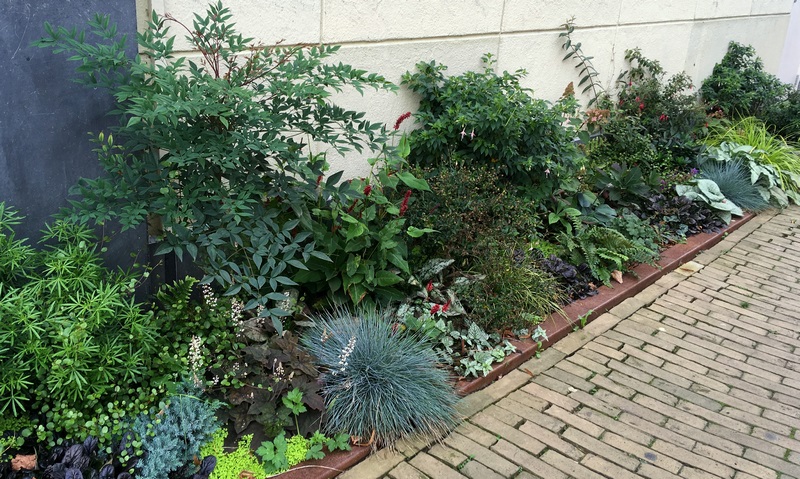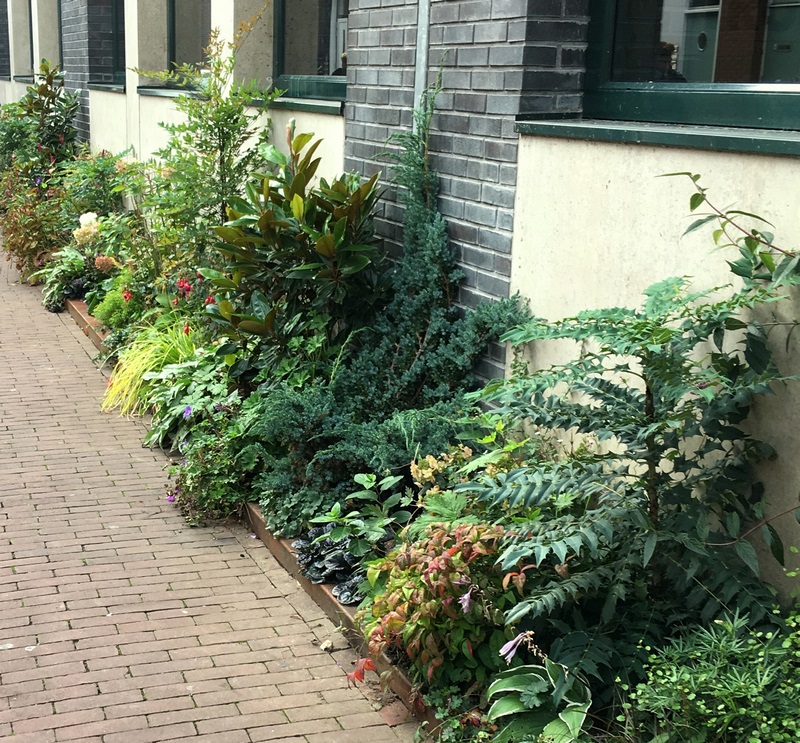 Amplio jardín de fachada en Nieuwstraat, un año después de la construcción. A la derecha, Choisya ‘White Dazzler’ junto a Muehlenbeckia axillaris, resitente al ambiente de la ciudad. Sobre ésta, algunas ramas con hojas angostas lanceoladas del árbol de hoja perenne, con floración fragante en invierno, Lonicera standishii‘Budapest’. Además, el frondoso Mahonia‘Media’, con forma de acebo, que florece a finales del otoño o al comienzo del invierno, con racimos amarillos que difunden la fragancia del lirio de los valles. En el centro, contra la fachada de ladrillo gris, el enebro azul Juniperus squamata ‘Meyeri’, justo al lado de Magnolia grandiflora ‘Little Gem’, con brillantes hojas perennes. Más en el fondo, Nandina domestica e Hydrangea paniculata ‘Lime Light’, rodeada por Persicaria amplexicaulis ‘Blackfield’ y ‘Dikke Floskes’, todo tipo de geranios y hierbas perennes. En la parte delantera de las hojas verde grisáceo con el borde color crema de Hosta ‘Valley’s Sushi’ y también el compacto Nandina‘Firepower’. Varios arbustos en esta franja pueden tener al menos dos metros de altura.