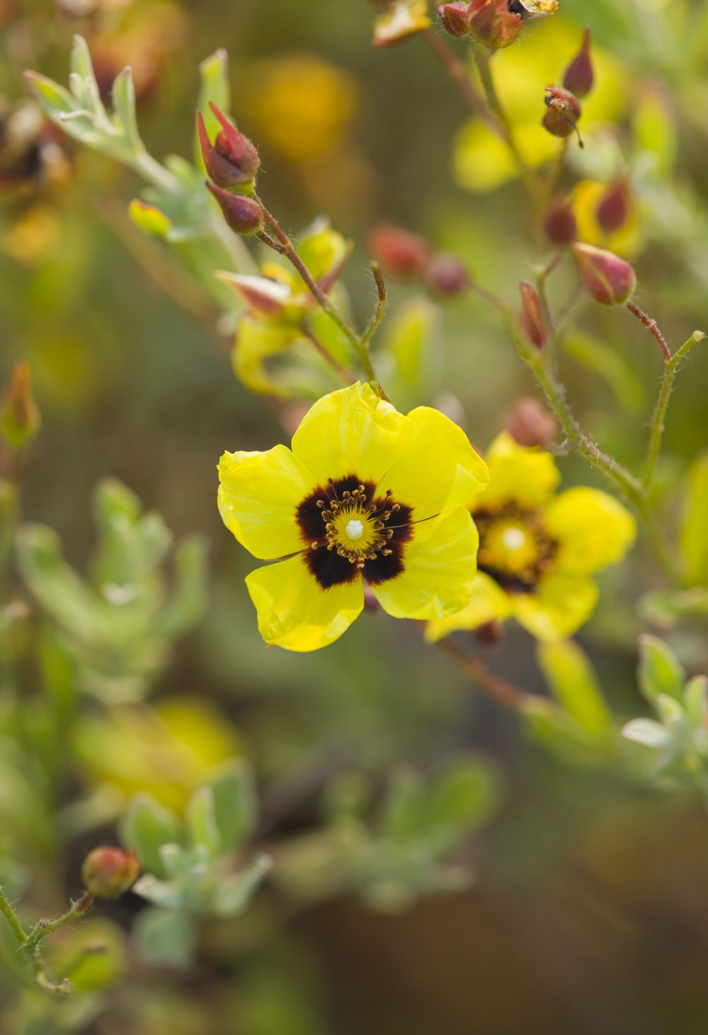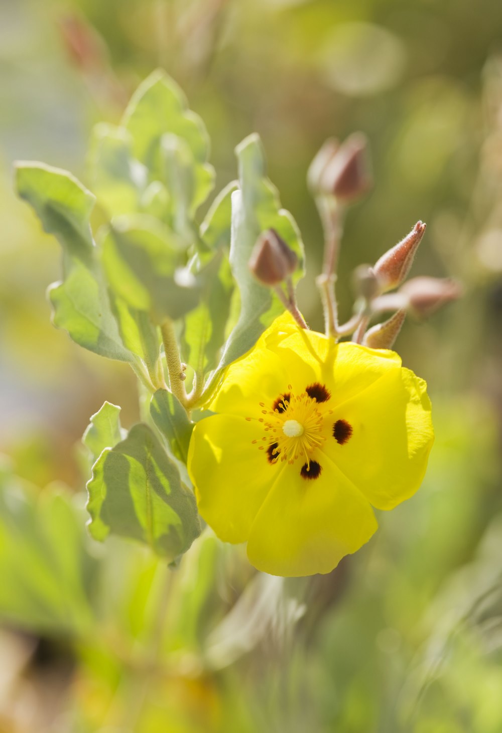 Puede alcanzar unos 80 centímetros de altura y 60 centímetros de extensión, con hojas son de color gris brillante, que en verano se vuelven plateadas. Produce abundantes flores de color amarillo dorado con manchas rojas en mayo y junio, aunque puede alargar su periodo de floración hasta finales de julio, incluso durante todo el verano, a pesar del calor y a sequía.