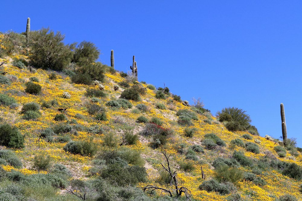 En esta ocasión, las imágenes nos muestran masas de amapolas de oro mexicana floreciendo en el mes de marzo en el desierto, concretamente al norte de Phoenix, Arizona (Estados Unidos).