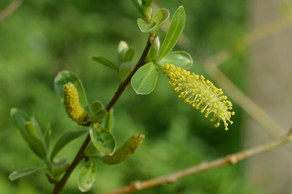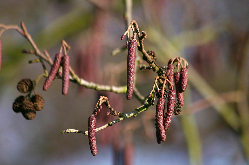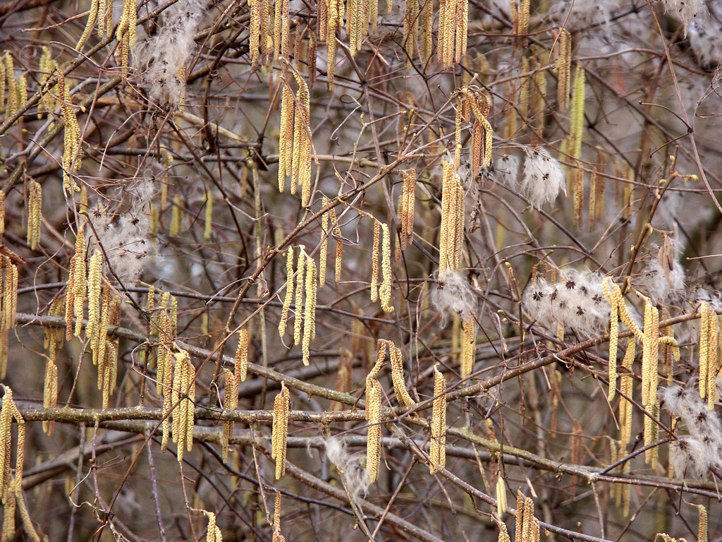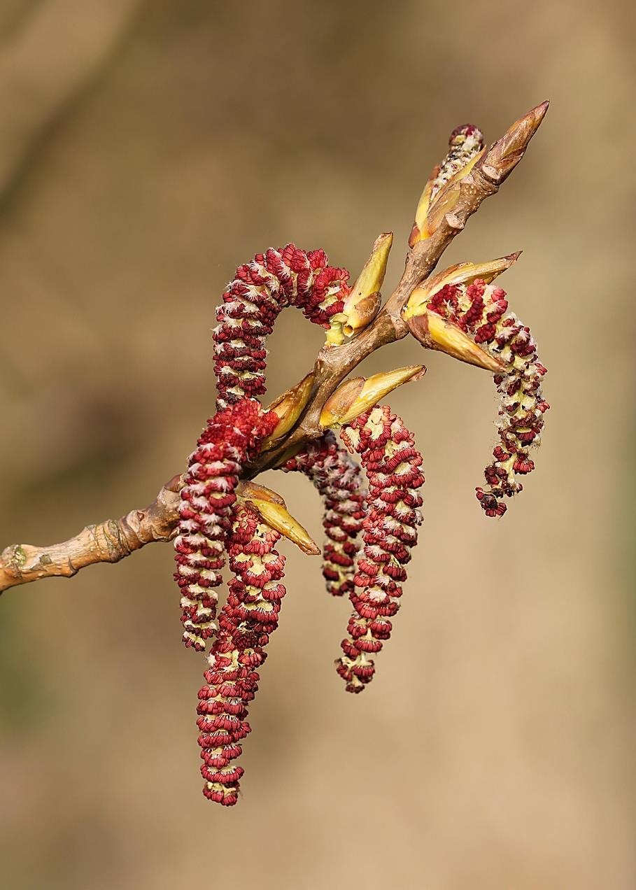 Los amentos cortos, gruesos y de color verde arrojan polen al mismo tiempo que las yemas de las hojas liberan su agarre sobre el follaje de color púrpura.
