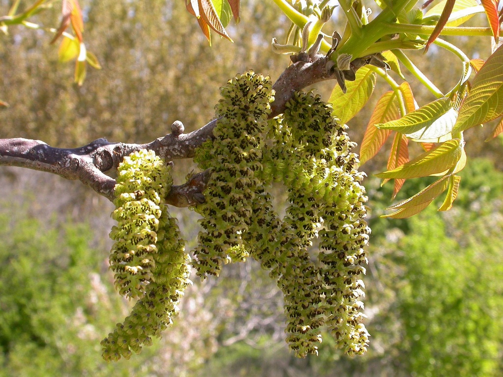 Las flores femeninas aparecen en ramos colgantes alargados (amentos) y gruesos que suelen aparecer en la parte alta del árbol.