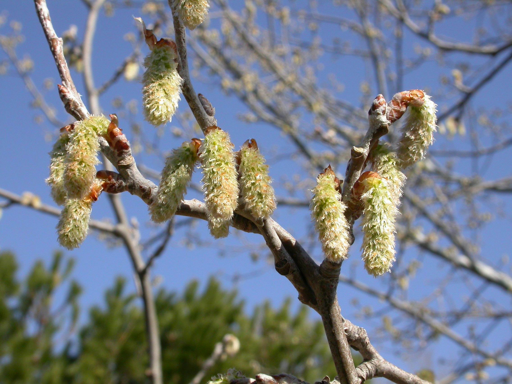 Las flores masculinas que aparecen entre enero y marzo se disponen en largos pedúnculos colgantes (amentos) que albergan el polen.