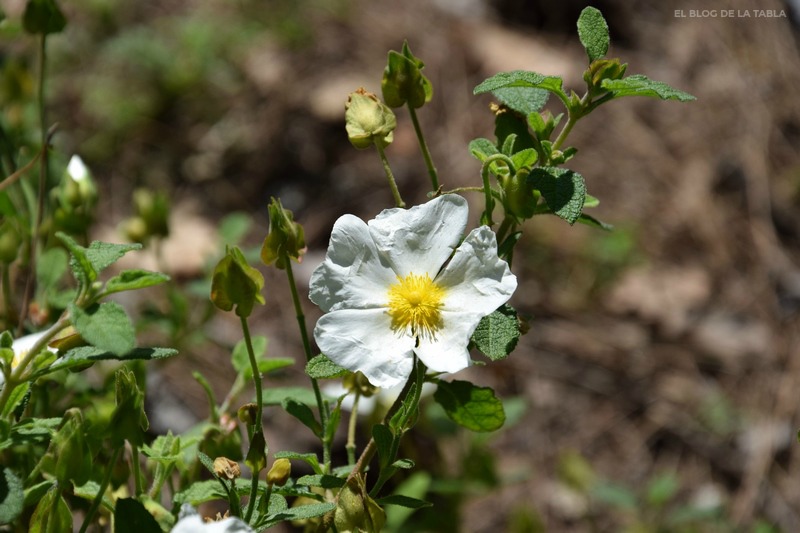 Como comentaba antes, las hojas de Cistus creticus son más parecidas a las de Cistus salviifolius, redondeadas, con los nervios reticulados bien marcados y de color verde oscuro. Los diferenciaremos por la parte basal de las hojas, en Cistus creticus los pecíolos abrazan el tallo formando una pequeña vaina, mientras que Cistus salviifolius los pecíolos son libres y no forman esta vaina; además, como puede apreciarse en las fotos, esta especie tiene las flores blancas, con lo que el problema queda resuelto si las plantas están en flor.