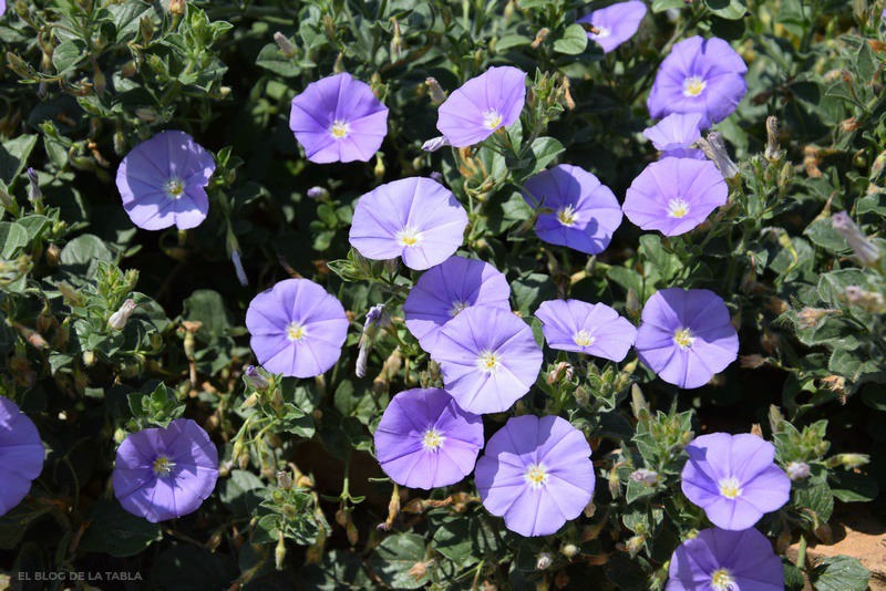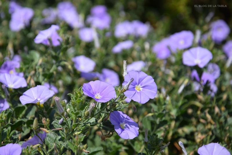 Estoy muy acostumbrada a ver por aquí y por allá algunas de las especies silvestres de corregüela (Convolvulus spp) de esta zona salpicando (y enredando) el campo con sus flores durante la primavera, el verano e incluso el otoño. Pero hoy mis ojos se van a Italia, porque el delicado color azul lavanda de las flores en forma de pequeñas campanas de Convolvulus sabatius, otra planta mediterránea tolerante a la sequía que me fascina.