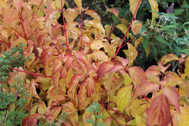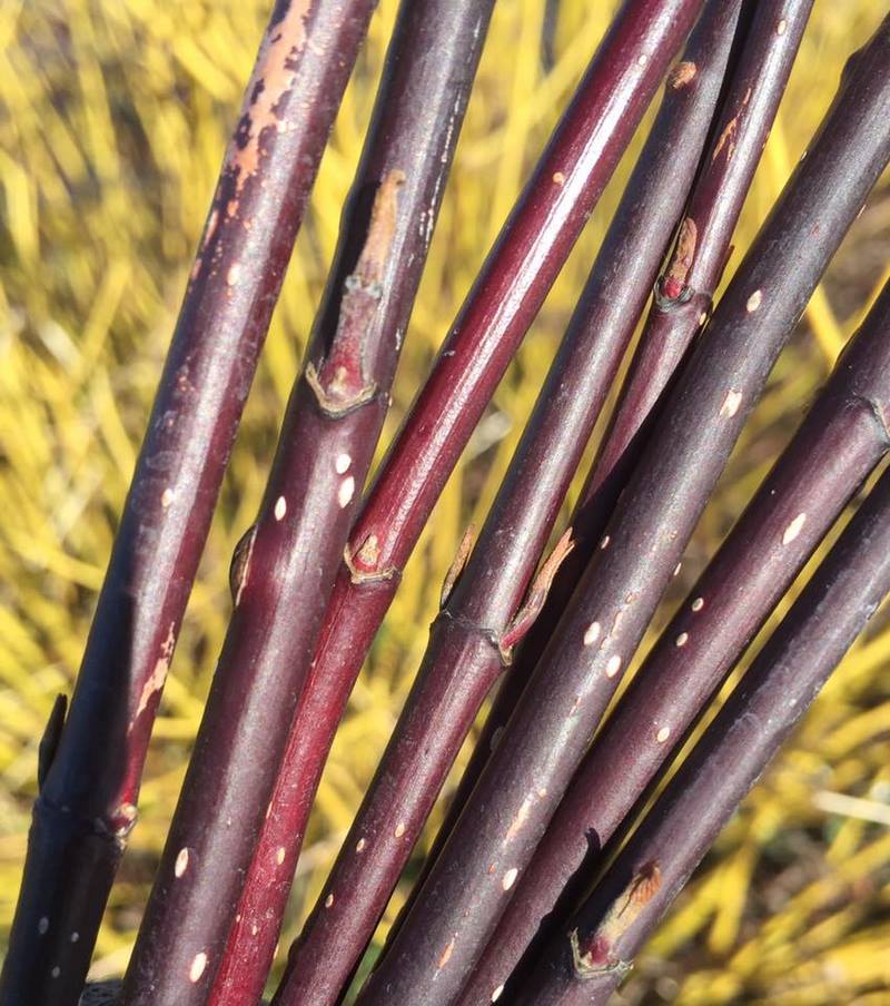 Con suaves hojas verdes en verano que se toman atractivos tonos de naranja y amarillo en otoño. Los tallos de invierno desnudos son de color amarillo en la base, color que se profundiza con las heladas a naranja y rojo en las puntas.