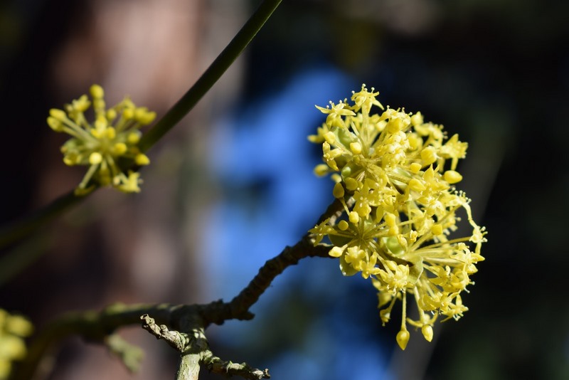 Los cornejos de esta especie lo forman arbustos grandes con delicadas flores amarillas al final del invierno y frutos rojos brillantes al final del verano.