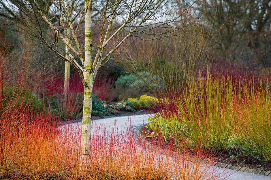 Los espectaculares tallos de invierno en color amarillo-naranja-rojo justifican la popularidad de esta variedad de Cornus en el diseño de jardines de invierno.