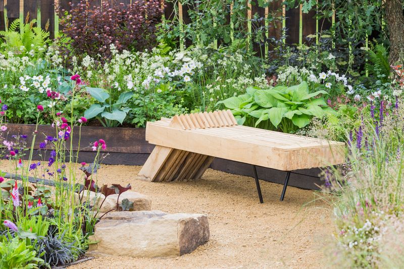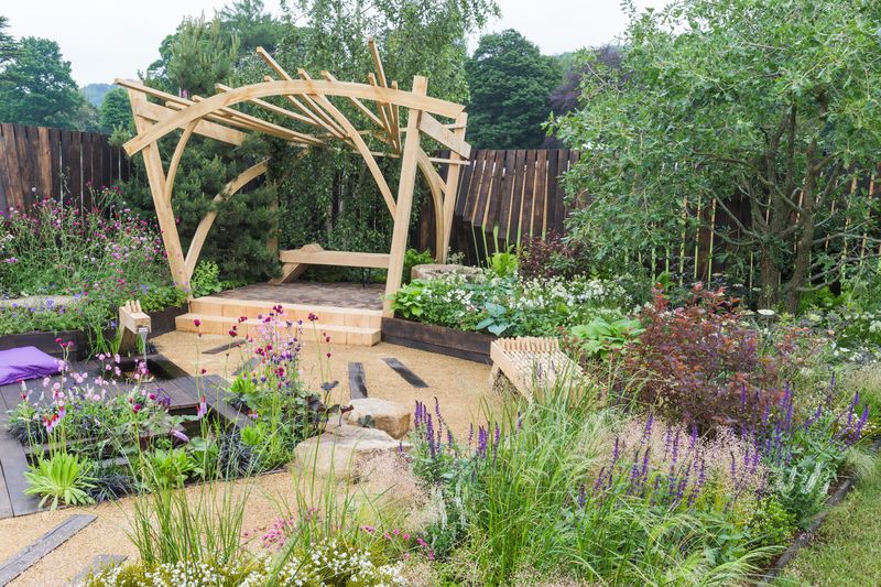 Un jardín celebra el entorno natural y rural, evocando la belleza de los bosques y páramos a través de las estructuras y la plantación, que incluyen pérgolas irregulares y roble como material principal (The Great Outdoors)