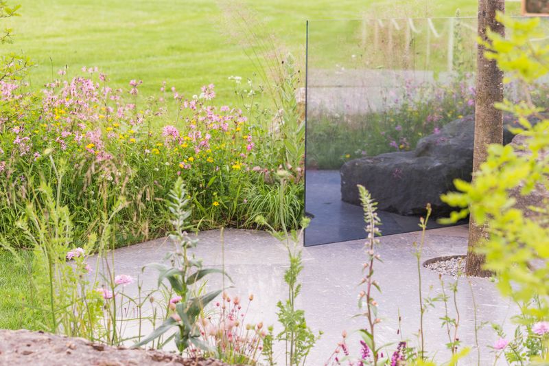 En el diseño, un gran panel de espejo refleja el área que rodea el jardín. Los árboles pequeños y las plántulas de roble se tejen a través de una plantación mixta de vivaces que evoluciona para convertirse en una exuberante pradera, como si el jardín se hubiera auto sembrado.
