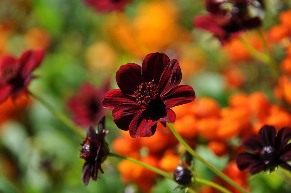 La especie Cosmos atrosanguineus (Cosmos Chocolate), una herbácea perenne (vivaz) que crece a partir de tubérculos, también se ha incorporado a los jardines por el atractivo color rojo carmesí de sus flores, que ofrece un fascinante impacto visual, especialmente si se combina con gramíneas ornamentales; y su ligero aroma a chocolate. Sus cultivares son especialmente buscados, aunque es una algo planta menos resistente que los cosmos anuales.