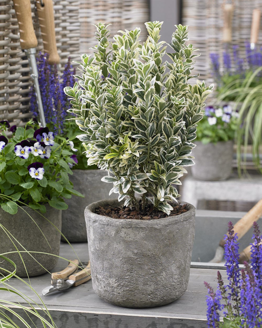 Euonymus japonicus ‘White Spire’ es un arbusto perenne muy rústico (Resistente a -15 ºC) que llega a alcanzar 50 centímetros de ancho y extensión. Se puede plantar en todo tipo de suelo, al sol o sombra parcial, y no necesita poda una vez establecido. En el jardín es ideal para crear setos bajos, plantación en masa, en solitario o en borduras y parterres. Es también un planta que funciona bien en macetas y contenedores.