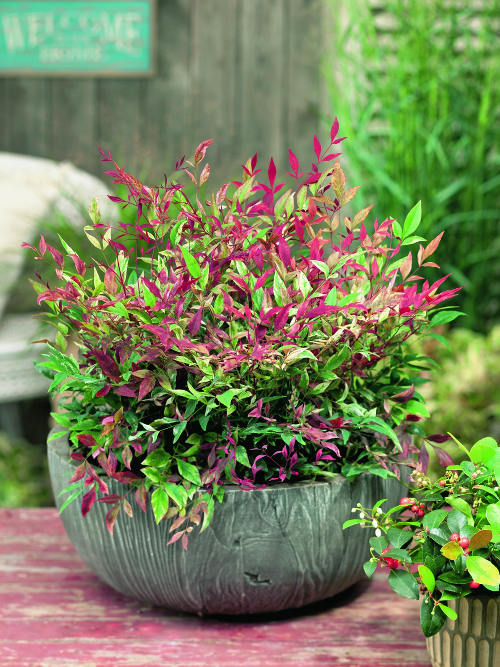 Otra nandina con vistoso follaje en invierno y bajo mantenimiento. En este caso, Nandina domestica ‘Red Light’ es un arbustos perennifolio de crecimiento compacto y tupido, con follaje abigarrado que tiene tonos de rosa, verde y blanco. Puede alcanzar una altura de unos 60 centímetros y se extiende hasta 50 centímetros. Prospera mejor al sol o semisombra en un suelo bien drenado y es resistente hasta a -18ºC