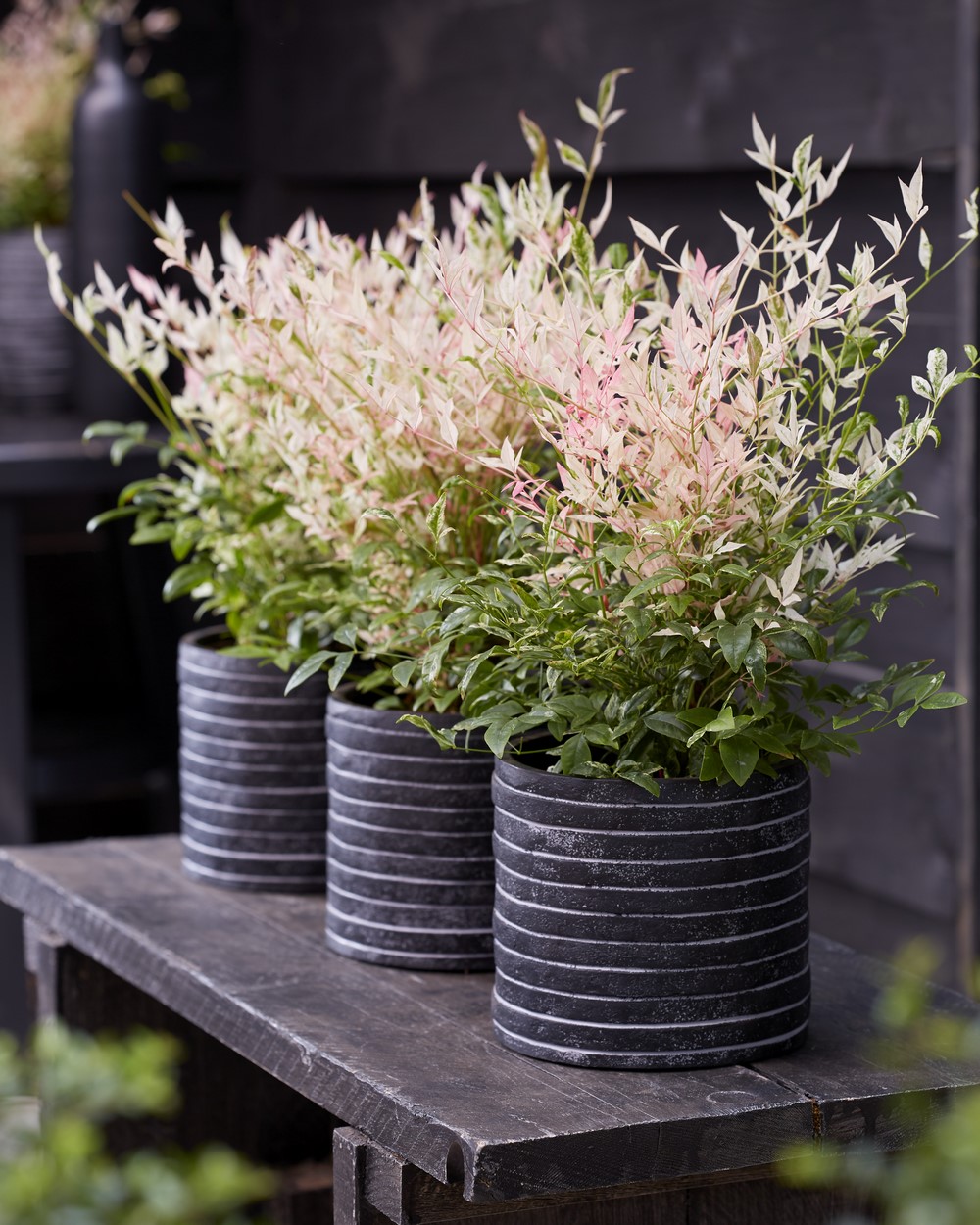 El follaje variegado en tonos de bronce, verde radiante y blanco le dan a esta nandina un efecto espectacular. El cultivar Nandina domestica ‘Twilight’ es un un arbusto tupido, erguido, de hoja perenne a semi-perenne, que alcanza unos 60 centímetros de altura y 50 centímetros de extensión.