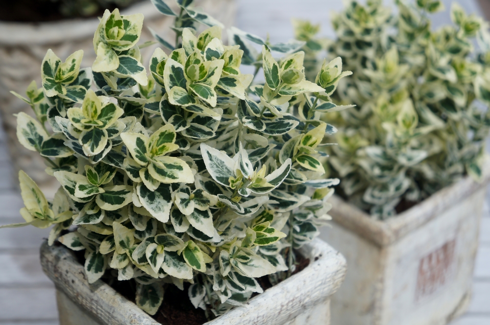 Otro cultivar de evónimo, en este caso de la especie Euonymus japonicus, que tiene follaje verde con un amplio borde blanco y conserva su color durante todo el año.