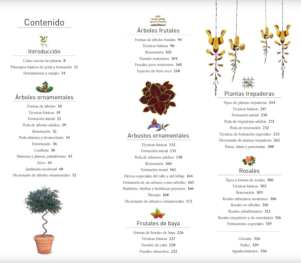 Desde ese punto de vista, en el libro se analiza cada grupo de plantas por separado, atendiendo a los diferentes requerimientos. En la introducción se explica cómo crecen las plantas, los principios básicos de poda y formación, así como las herramientas y equipo necesarios.