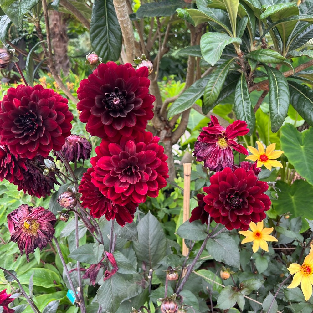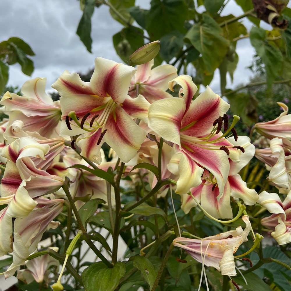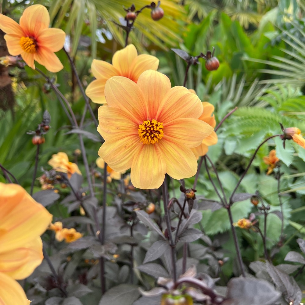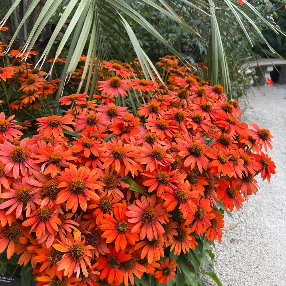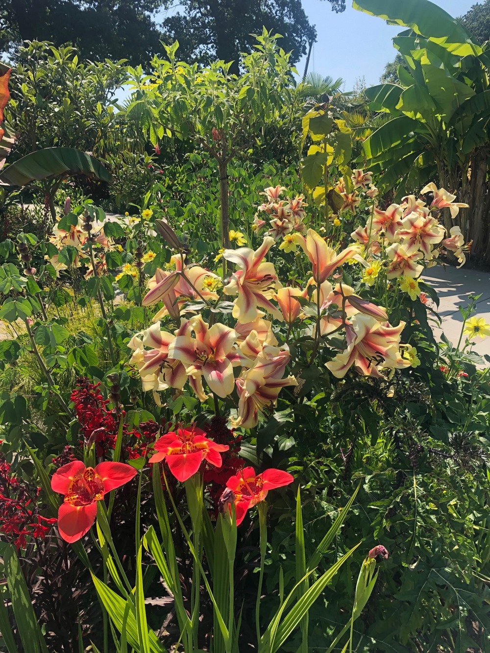 Azucenas (Lilium), equináceas (Echinaceae) y otras plantas de floración estival van dando paso, a medida que se aleja el verano, a los aspectos más destacados del otoño, que vendrán con plantas como Melianthus major, cañas de Indias, entre las que destaca Canna ‘Purpurea’, y vistosas flores de dalias, ellas Dahlia ‘Karma Choc’, Hadrian’s Sunlight’ y ‘Waltzing Matilda’.