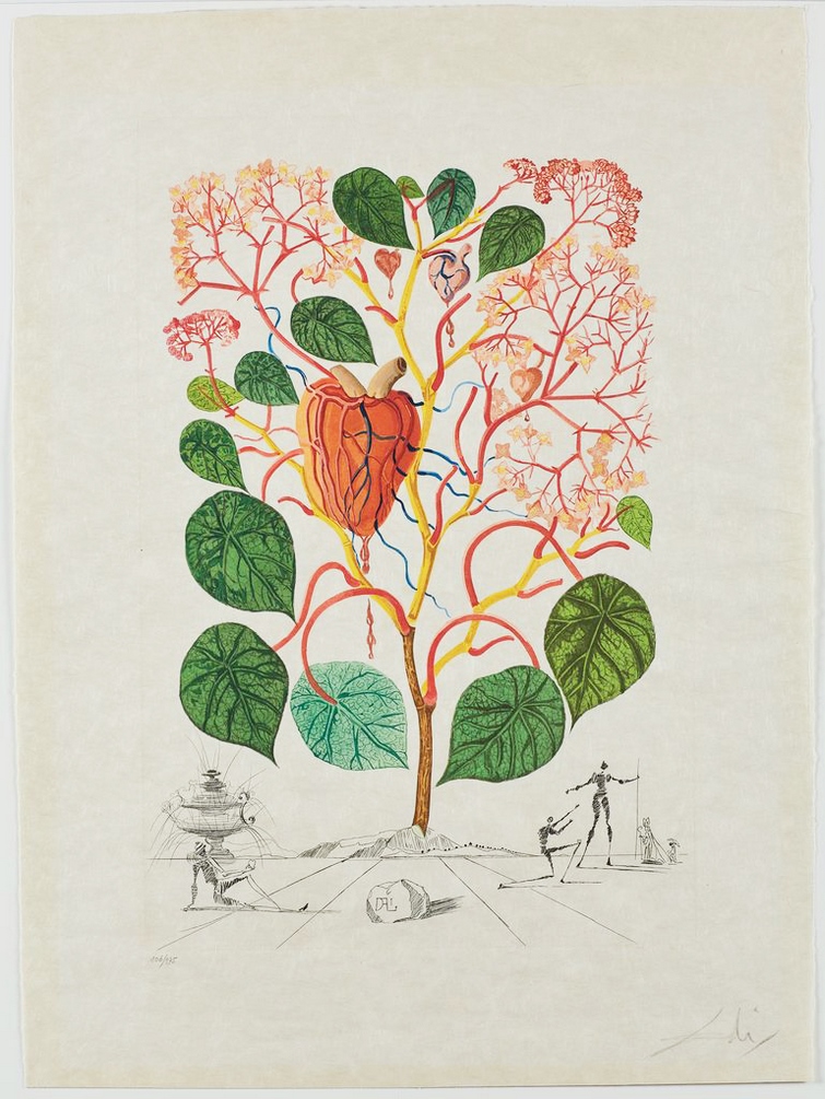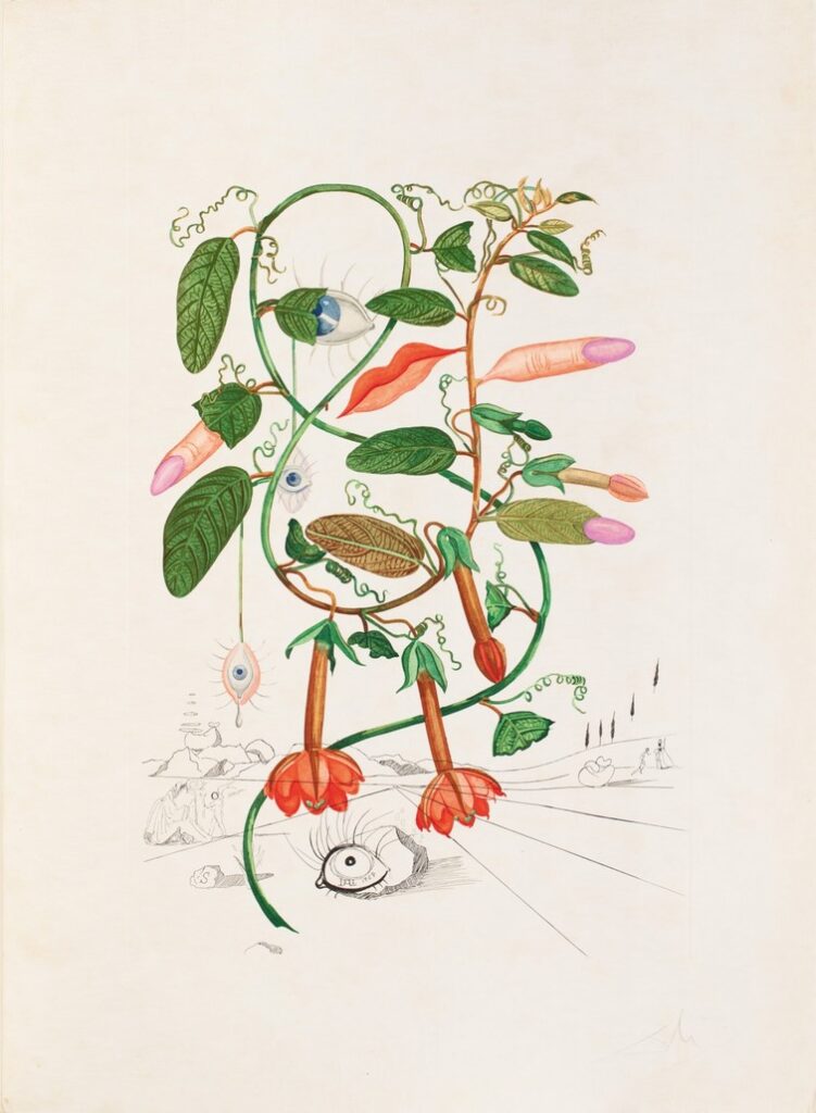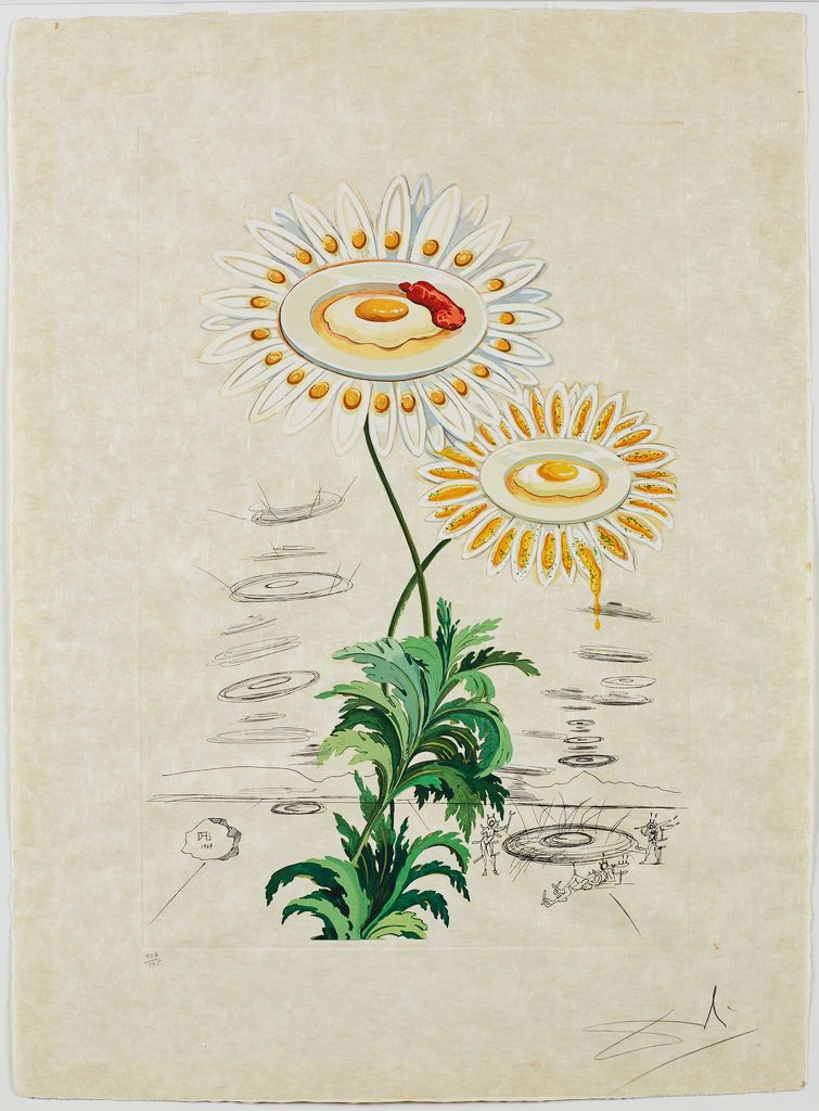 Combinando la flora con los motivos característicos del artista, esas dos series de grabados subrayan el continuo enamoramiento de Dalí con su paisaje natal de Cataluña y las intrigantes imágenes de sus obras surrealistas. Son flores que perturban lo que creemos saber sobre la realidad, al yuxtaponer elementos aparentemente incongruentes.