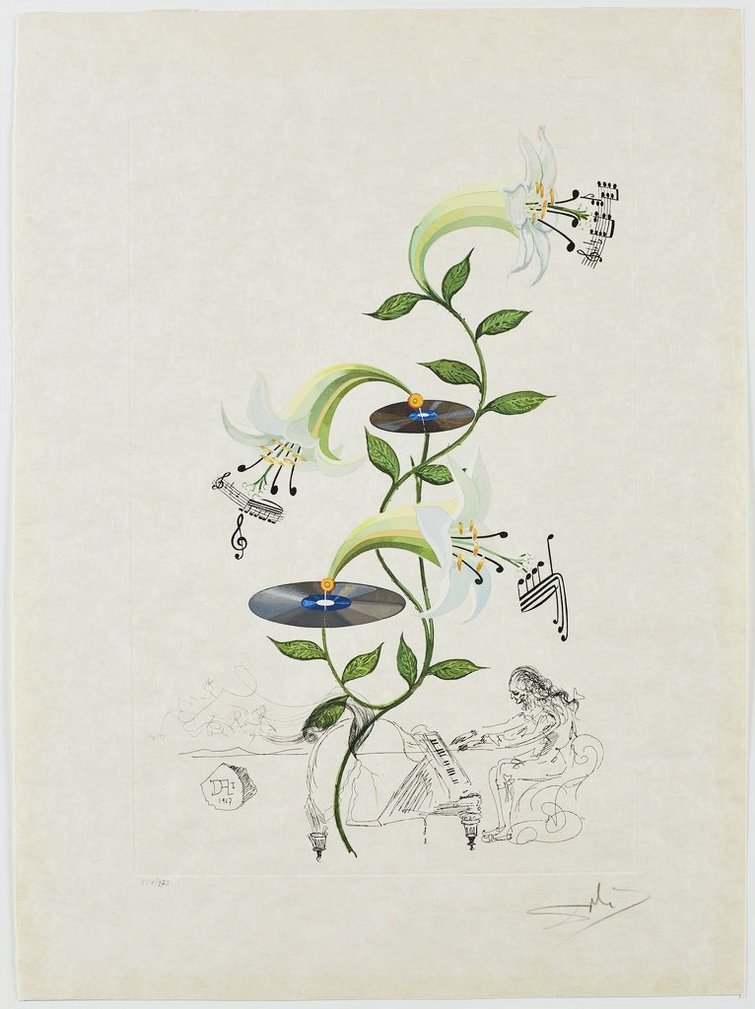 La versión de Dalí del lirio o azucena, símbolo de pureza durante mucho tiempo, las notas musicales brotan de los capullos de los discos del fonógrafo, dando a entender que la música también goza de esa cualidad.