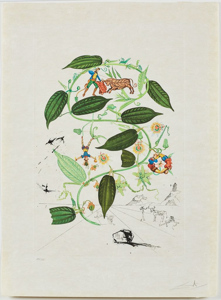 Otra de las pasifloras de sus grabados se convierte en un verdadero carnaval, donde no faltan acróbatas y una corrida de toros. Y, con la combinación de rosas y mariposas (imagen de portada), Dalí rinde homenaje a dos de los pintores de flores franceses más famosos: Pierre-Joseph Redouté (1759-1840) y Georg Dionysus Ehret (1708-1780).