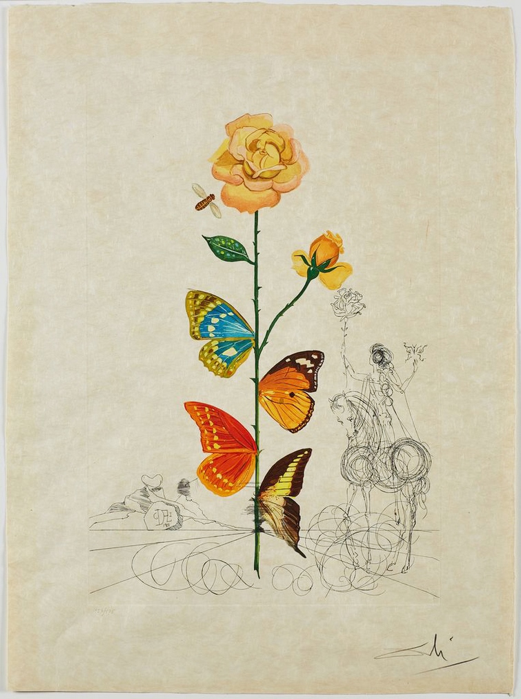 En la década de 1960, Dalí comenzó a incorporar elementos de collage como grabados botánicos y de mariposas en sus obras en papel, y con el tiempo sus nuevos trabajos en papel fueron convertidos en impresiones litográficas por artesanos.