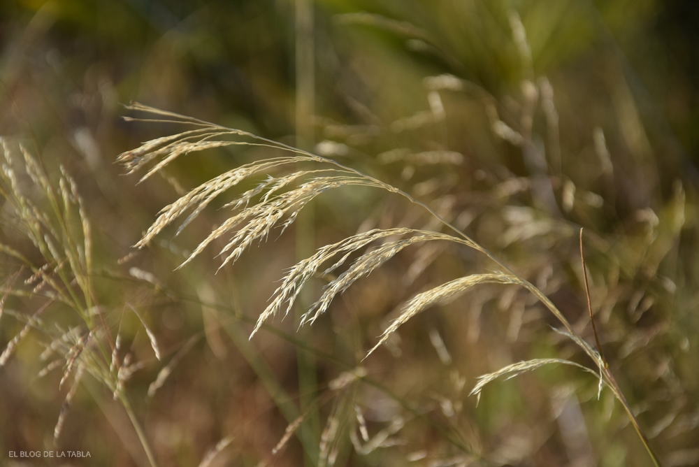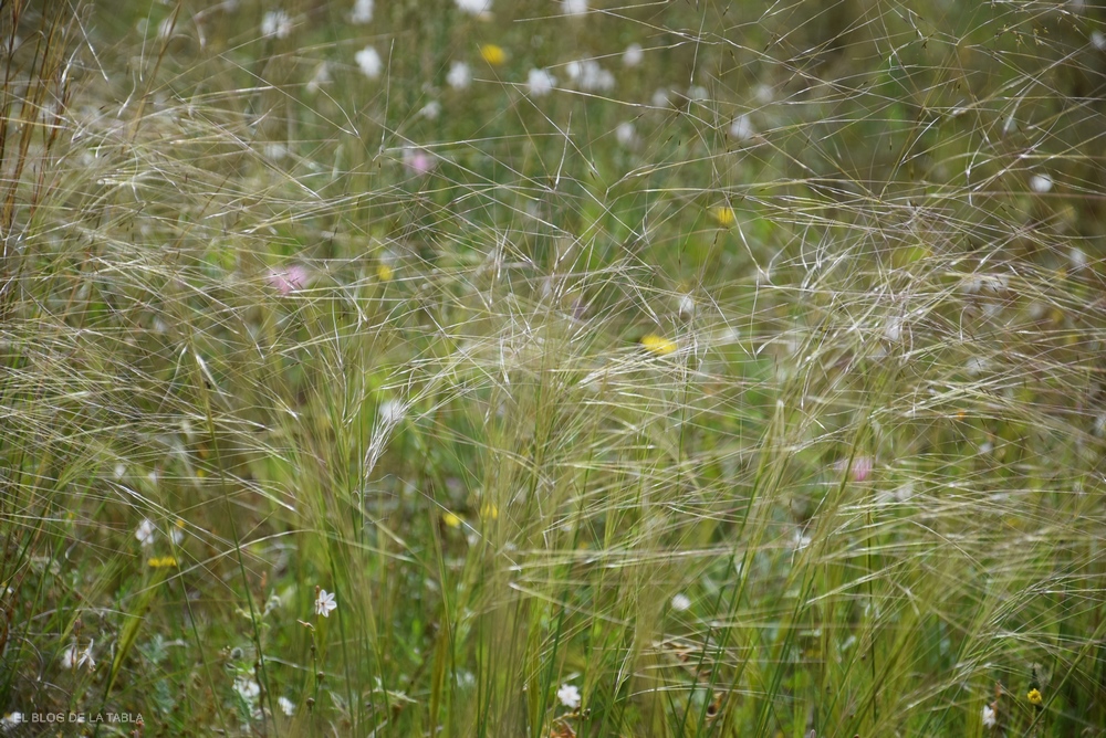 Parece ser que su nombre científico ahora es Achnatherum parviflorum, pero seguiré llamando a esta delicada gramínea silvestre Stipa parviflora, que es más sencillo (tampoco me gusta mucho uno de sus nombres vernáculos: pelos de bruja).
