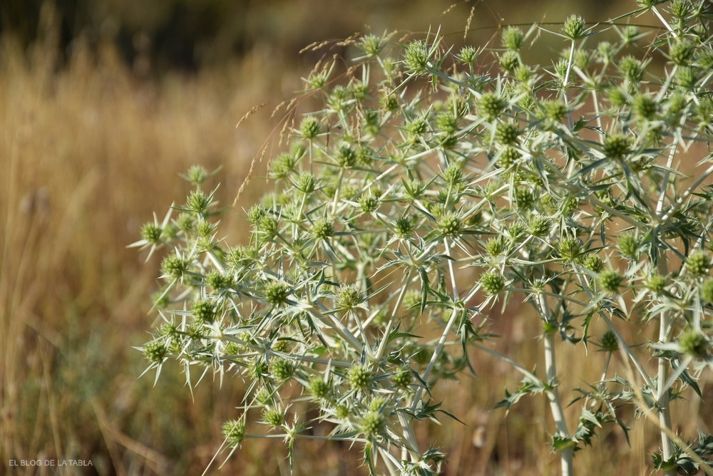 Claro que, sin duda, para mí el verano en esta zona es sinónimo de otra umbelífera, el cardo corredor (Eryngium campestre), que suele florecer entre mayo y octubre. Vive en los campos y claros de los matorrales y su distribución nativa se sitúa desde Europa hasta el Cáucaso, y el noroeste de África.