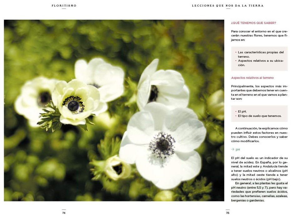 En la primera parte del libro también nos hablan de las flores como terapia y de los cimientos del cultivo orgánico. La segunda parte, titulada “Lecciones que nos da la tierra”, está dedicada a mostrar paso a paso el proceso de cultivo de plantas de flor y, al final del libro, también se incluyen fichas de plantación.