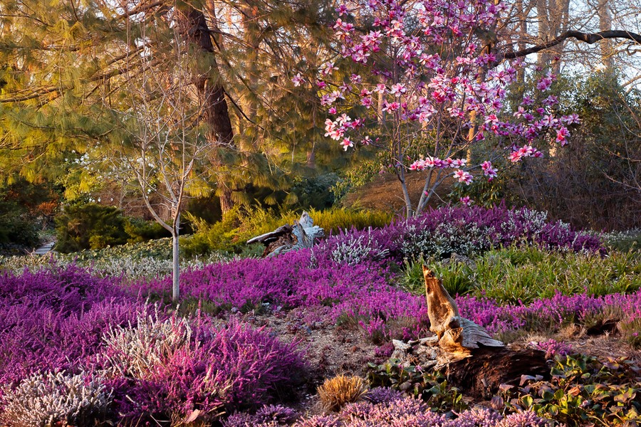 En esa fotografía, hecha en uno los primeros días de la primavera, Claudia muestra una combinación de brezos en flor en varios tonos de púrpura, que sirven de alfombra a un magnolio de flores rosas. Mientras, la luz del atardecer atrapa los árboles del fondo.
