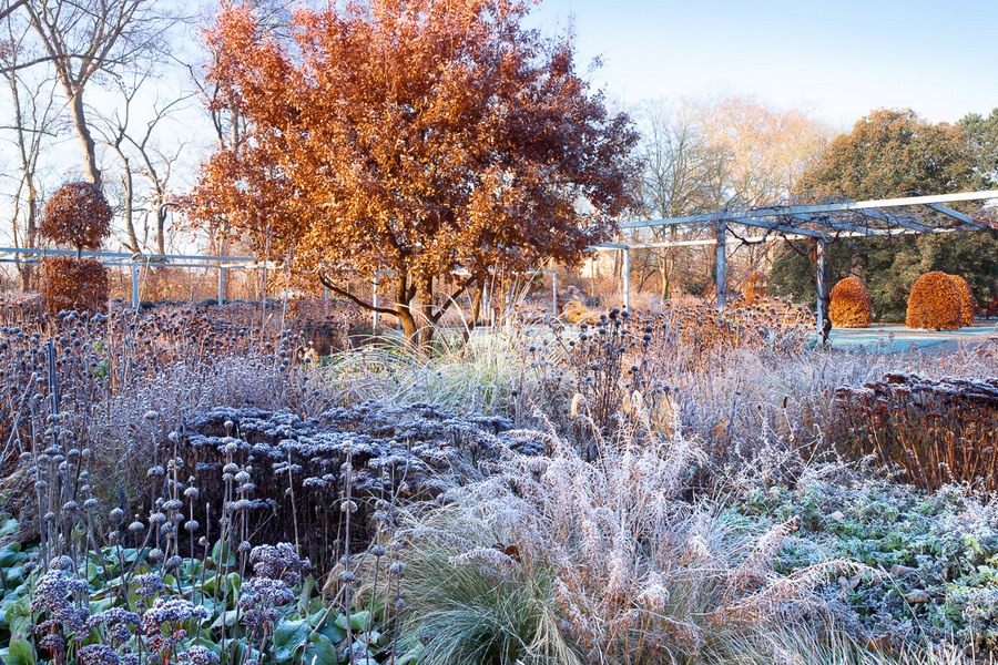 Otra foto muy elogiada fue la que Claudia Gaupp realizó en Ebertpark, un parque urbano en la ciudad alemana de Ludwigshafen del que he hablado en el blog, destacando sus plantaciones de estilo naturalista. La imagen está capturada en una heladora mañana de invierno, cuando las diferentes gramíneas y cabezas de semillas de plantas vivaces habían entretejido una brillante alfombra de escarcha, creand0 un atractivo contraste con el follaje marrón de un roble y algunas hayas en topiara al fondo, que también brillaba con la luz de la mañana.