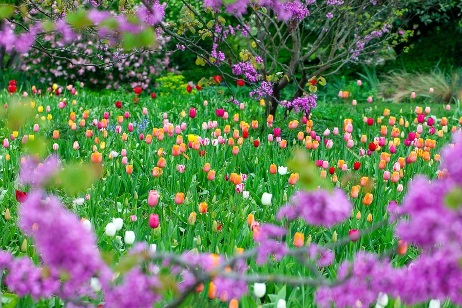 Más primaveral es la escena de ese mismo fotógrafo en Hermannshof, donde una cama de flores de tulipanes es capturada a través de las flores de un árbol del amor (Cercis siliquastrum).