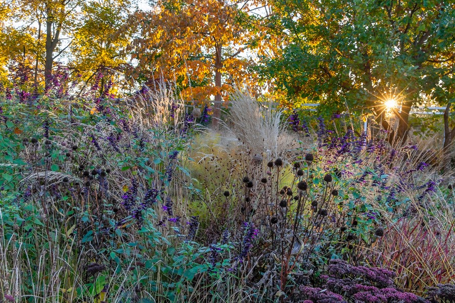 El fotógrafo de jardines y naturaleza alemán Martin Staffler también visitó Ebertpark, donde capturó la luz del atardecer en otoño. En la imagen, una combinación de gramíneas ornamentales, las últimas plantas vivaces en flor y las cabezas de semillas forman una unidad que contrasta con el telón de fondo de los árboles otoñales.