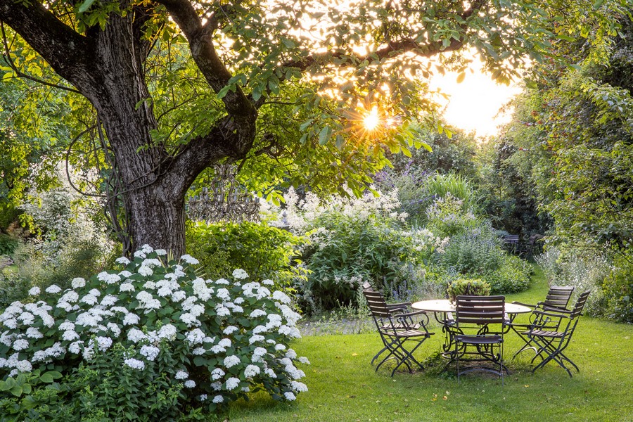 Sin movernos de Alemania, vamos a encontrar la escena de un jardín privado bajo un nogal (Juglans regia) que ha capturado Manuela Göhner, donde también se aprecian hortensias en flor y una mezcla de plantas vivaces.