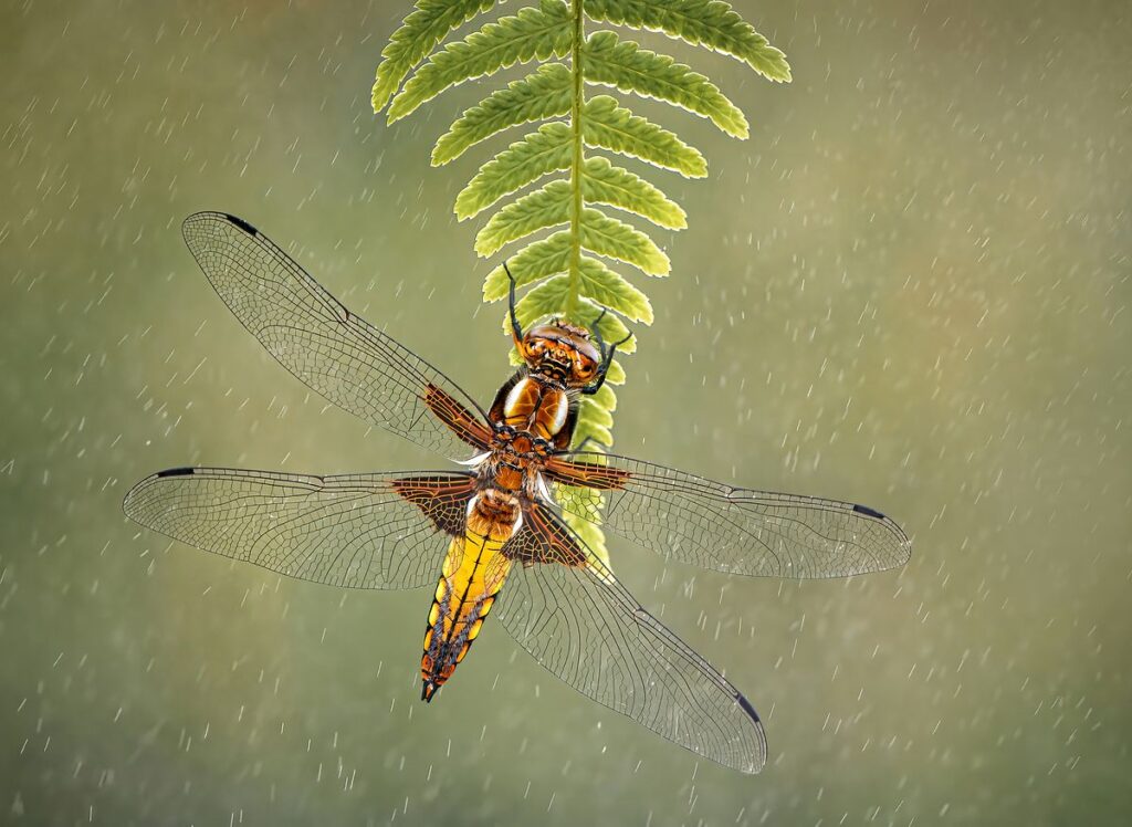 El fotógrafo británico Tony North capturó una libélula de vientre plano (Libellula depressa) hembra sobre una hoja de helecho. Un poco de agua pulverizada sirvió para crear el efecto de lluvia. Esa foto le valió el segundo premio de esta edición.