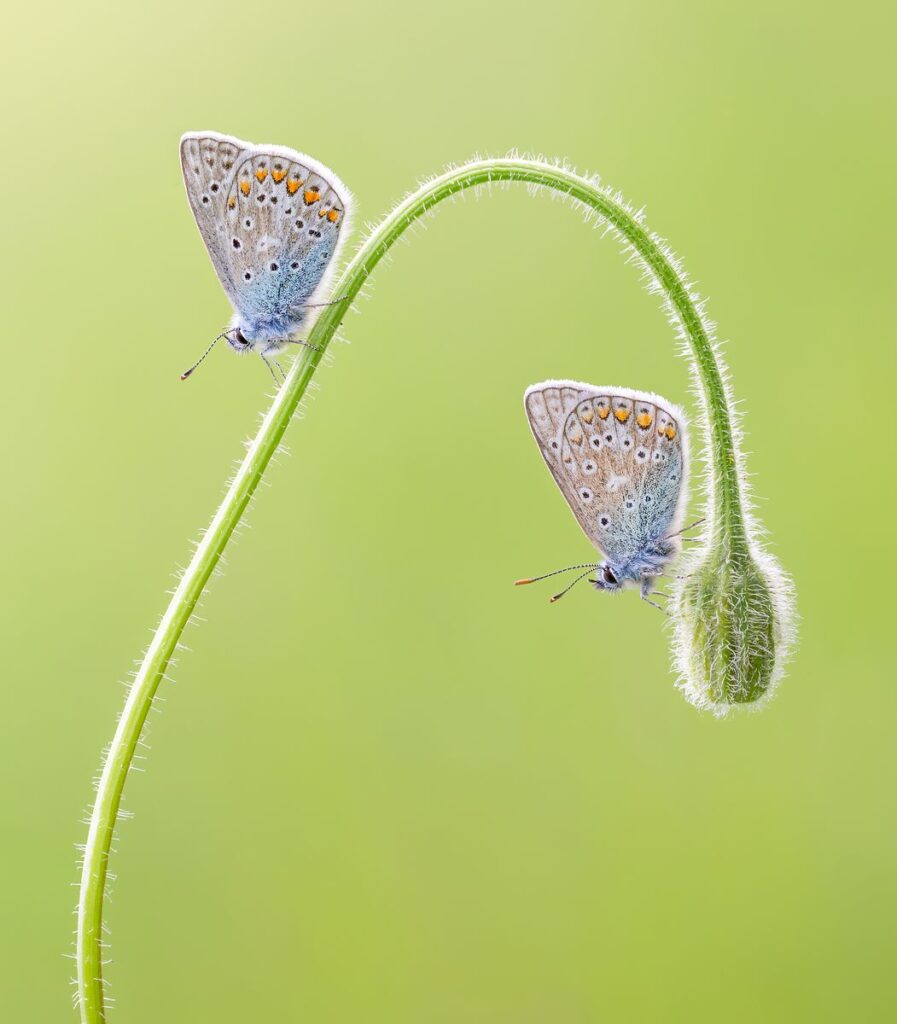 El fotógrafo británico Dr Qasim Syed ha capturado una imagen en la que se aprecia simetría, pero, como él mismo dice, con diferencias sutiles. La foto muestra dos mariposas azules comunes (Polyommatus icarus ) posadas sobre el único tallo floral de una amapola, donde su idéntico peso conseguía doblar la delicada estructura en la base. Para lograr esa fotografía, tomó varias imágenes con la cámara en la mano y luego las apiló juntas.