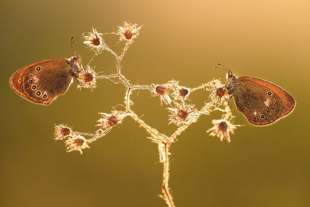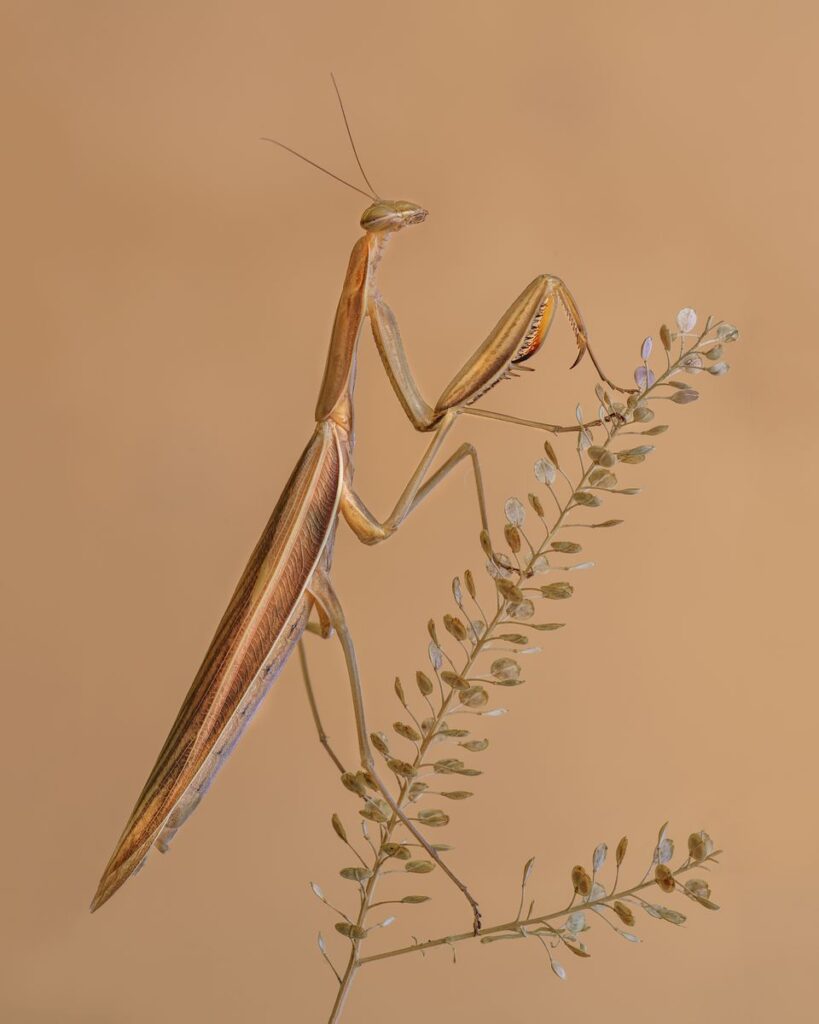 Petar Sabol también es el autor de la cálida imagen que muestra dos mariposas, conocidas popularmente como sortijitas (Aphantopus hyperantus), capturadas en reposo sobre una planta retroiluminada. También él ha capturado una imagen de perfil de una mantis religiosa trepando por el follaje. En la foto, el color de fondo complementario ha potenciado aún más la elegancia de esa captura.