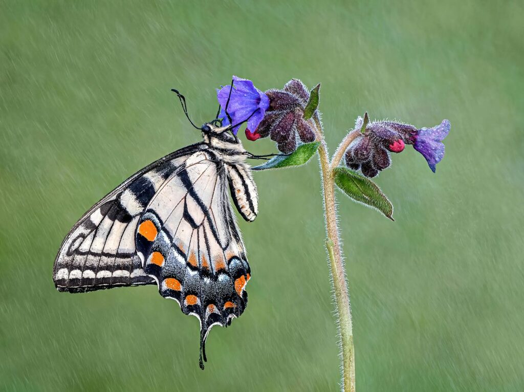 También fue finalista su fotografía de una mariposa cola de golondrina tigre (Papilio glaucus) sobre una flor de Pulmonaria, en la que, de nuevo, utilizó un poco de agua pulverizada para crear el efecto de lluvia. Además, Tony North ha tenido otro reconocimiento por una encantadora fotografía, realizada en su jardín trasero, de un escarabajo del romero descansando sobre flores de Myosotis (nomeolvides).