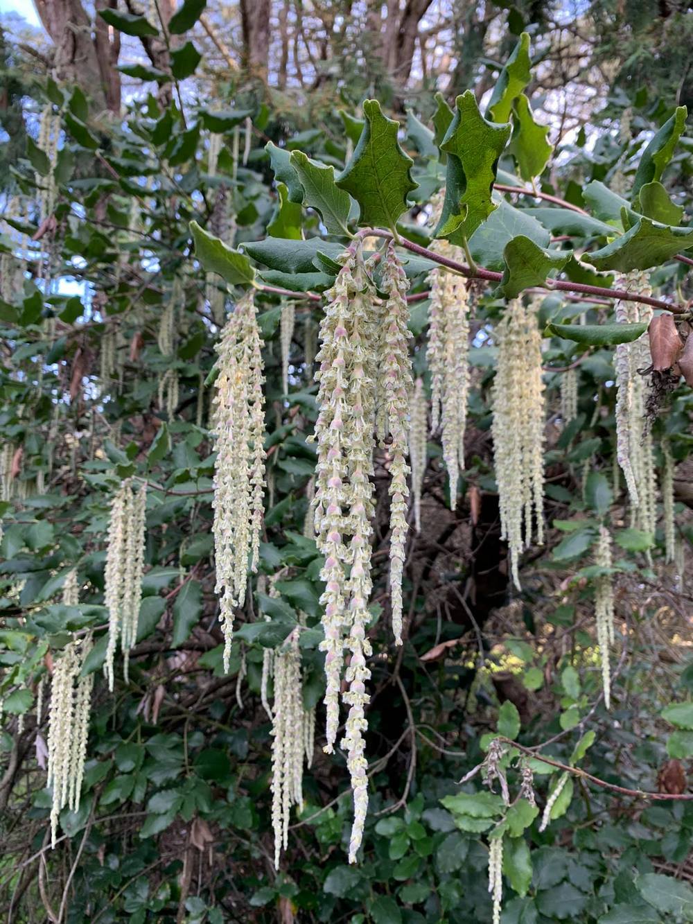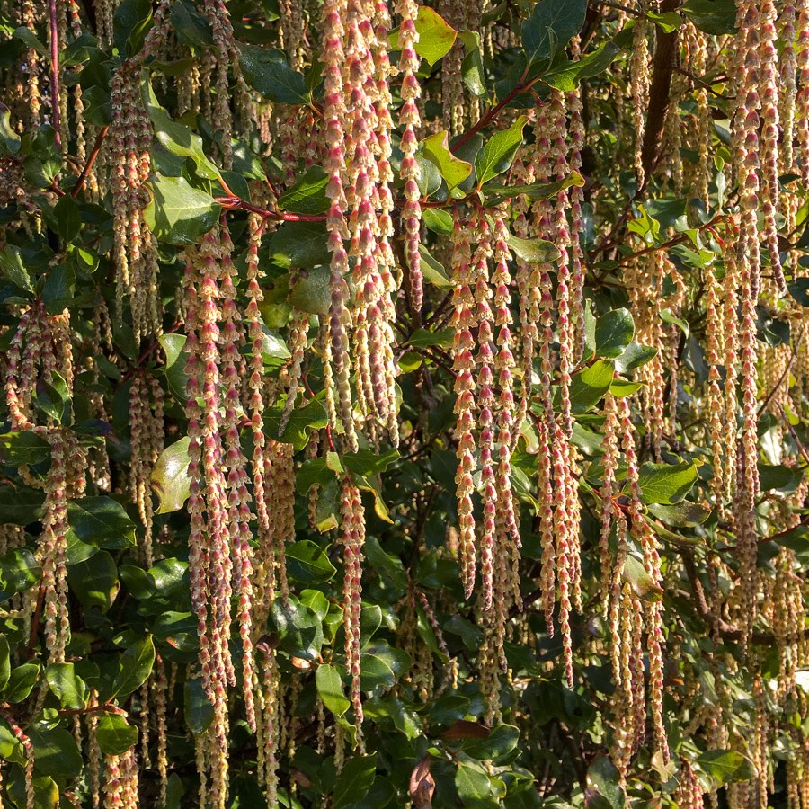 Garrya elliptica ‘Evie’ una forma que alcanza entre 4 y 6 metros de altura y presenta floración masculina seleccionada, con amentos de color blanco cremoso de 8 a 20 centímetros de largo que a menudo adquiere un tono violáceo.
