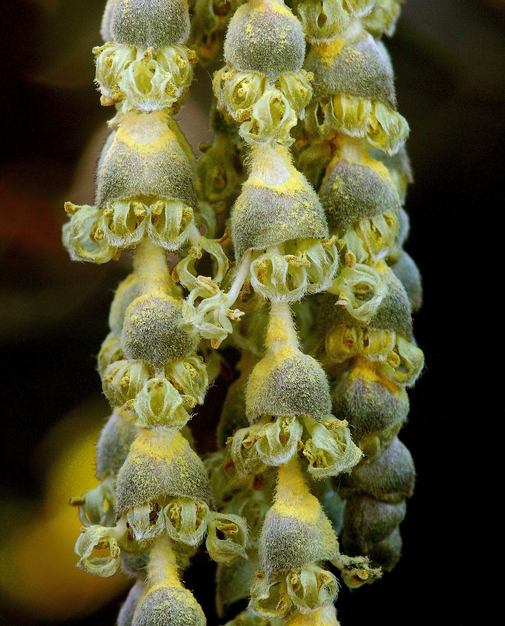 Lo cierto es que los amentos de las flores masculinas, de color verde grisáceo, son más largos y vistosos (de 8 a 20 centímetros, incluso 30 centímetros en algunos casos), por lo que las plantas masculinas son las que se suelen cultivar en jardines por su valor ornamental en invierno. Por su parte, las plantas femeninas, que se ven con menos frecuencia, producen racimos de hasta 9 centímetros de largo, con frutos de color marrón púrpura en verano.