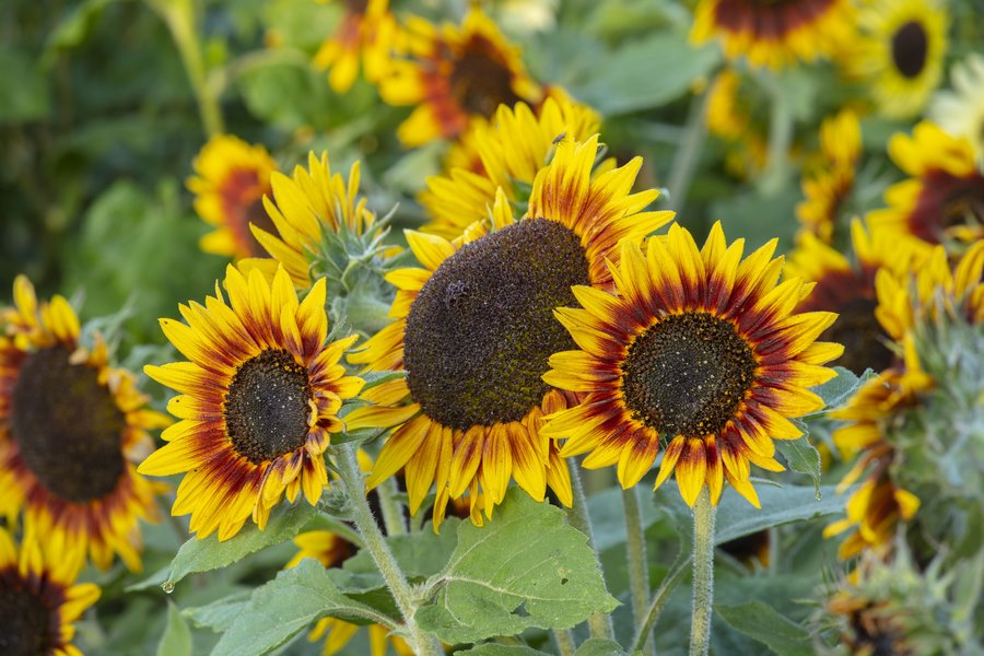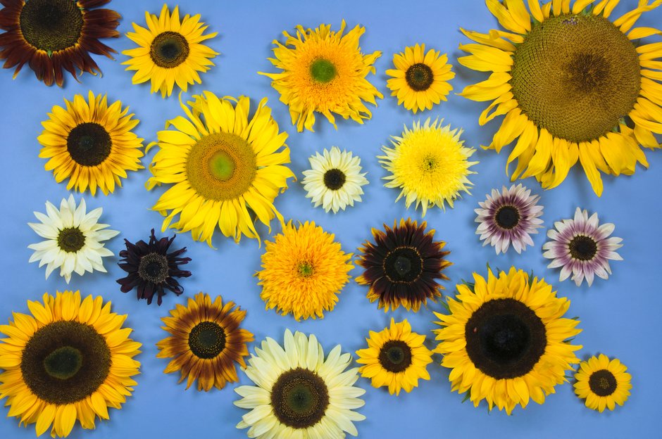 Helianthus annuus ‘Pastiche’, ‘Holiday’, ‘Lemon Sorbet’, ‘Greenburst’, ‘American Giant’, ‘Solar Power’, ‘Taiwanchai’, ‘Prado Gold’, ‘Cherry Rose’, ‘Starburst Lemon Aura’, ‘Buttercream’ y ‘Red Wave’ | © RHS/Tim Sandall
