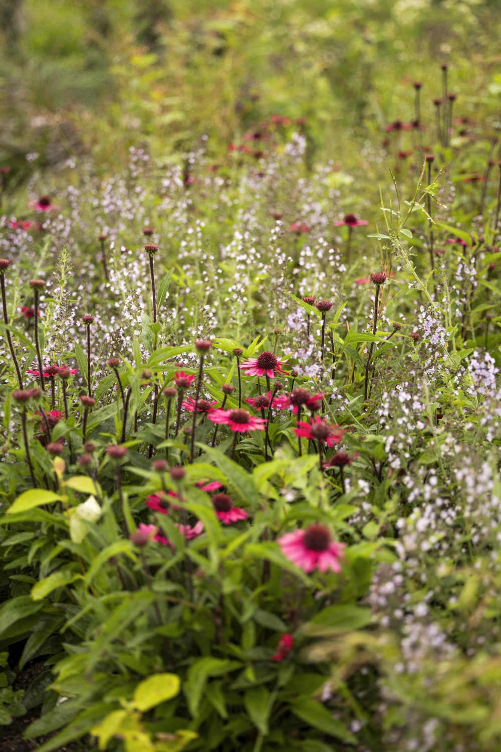 Echinacea purpurea ‘Fatal Attraction’, un cultivar más compacto que la mayoría, con flores rosa rojizo, que contrastan maravillosamente con las delicadas nubes de flores blancas de Calamintha nepeta subsp. nepeta. Hay una imagen en la que asoman las pequeñas flores tipo margarita en rosa pálido que podrían ser de Aster ‘Anja’s Choice’.