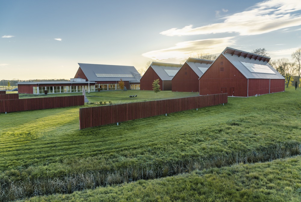 Los edificios del museo, construidos según un concepto original del galardonado arquitecto italiano Renzo Piano, recuerdan al monumental granero para secar heno, pintado de rojo y con un ingenioso tejado, que en su día estuvo en el lugar.