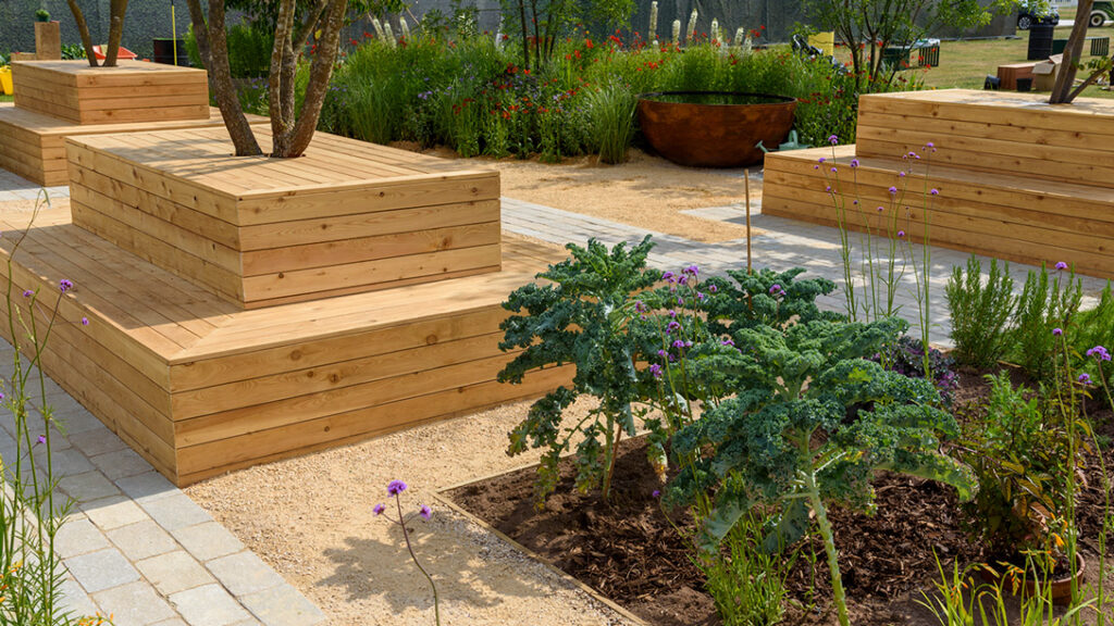 El jardín destaca lo prácticas que pueden llegar a ser las camas elevadas, con una combinación de plantas útiles, como zanahorias, lechugas, patatas o maíz; y plantas ornamentales, que incluyen especies vivaces resistentes a la sequía , gramíneas ornamentales y plantas para flor de corte, como dalias.