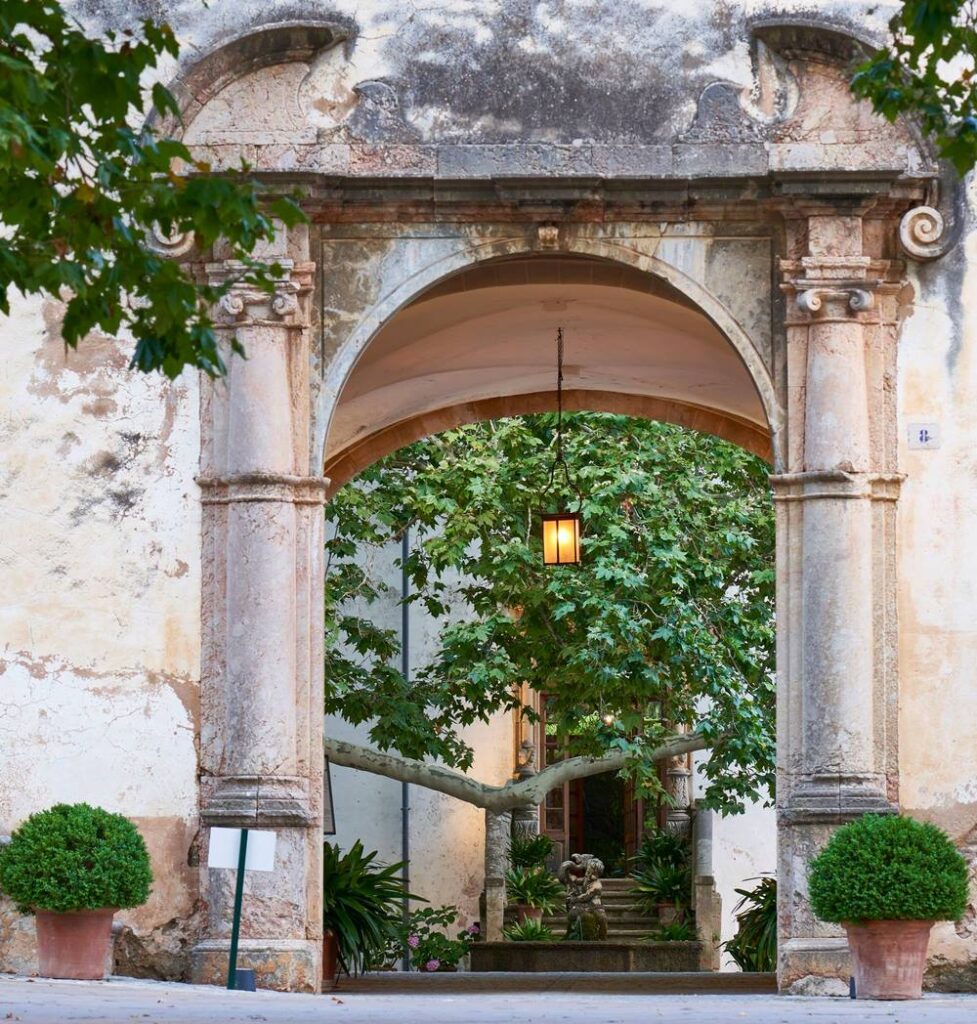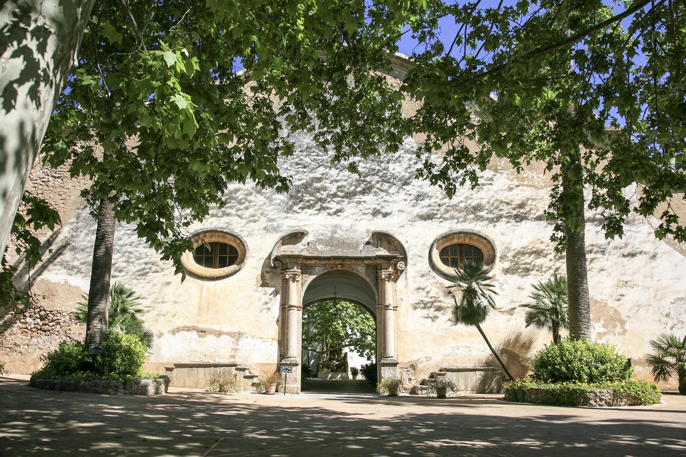 Los jardines históricos de esta antigua finca rústica tienen la herencia hispanoárabe común en Mallorca. El acceso consiste en una amplia avenida, o paseo de salón romano, con tres carriles de grandes plátanos, que llega hasta la clastra (patio interior).