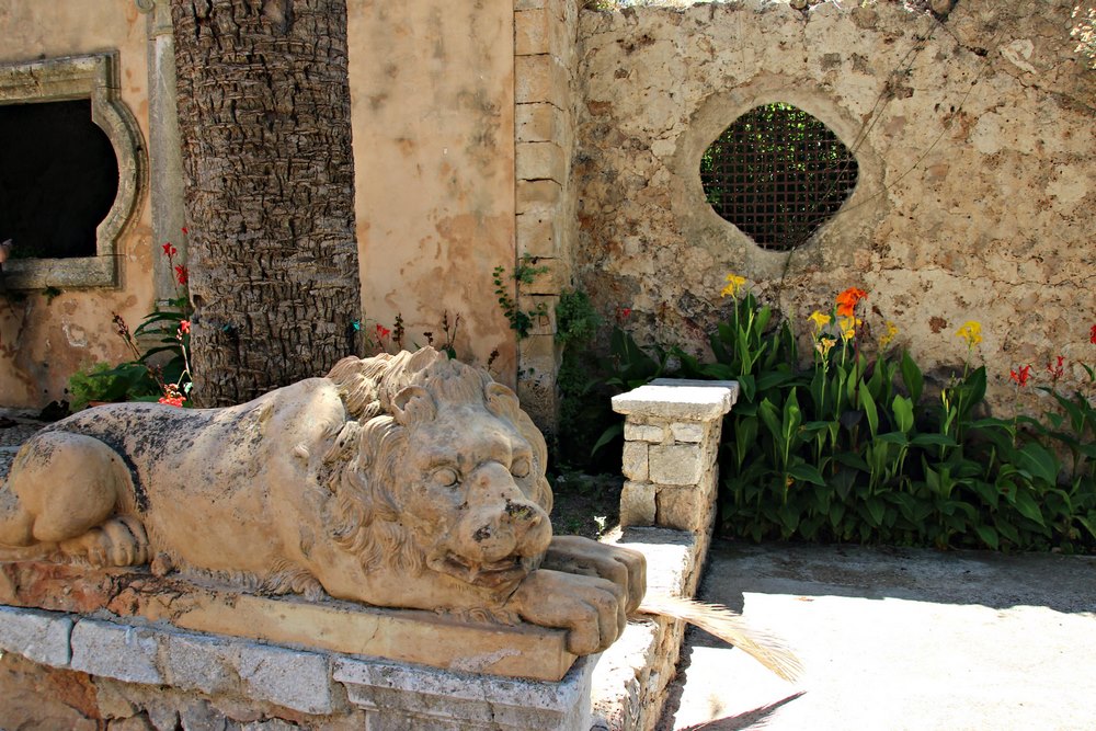 El jardín inferior, de aire tropical, tiene un estanque con nenúfares y está plantado con gran variedad de palmeras, entre las que no faltan los palmitos o garballons (Chamaerops humilis), palmeras enanas que se distribuye por las regiones secas a lo largo de la costa mediterránea, desde Italia hacia el oeste, pero excluyendo a Francia. Es común en las costas mediterráneas de España, sobre todo en las de Andalucía, Región de Murcia, Comunidad Valenciana, Islas Baleares; y el norte de Marruecos.