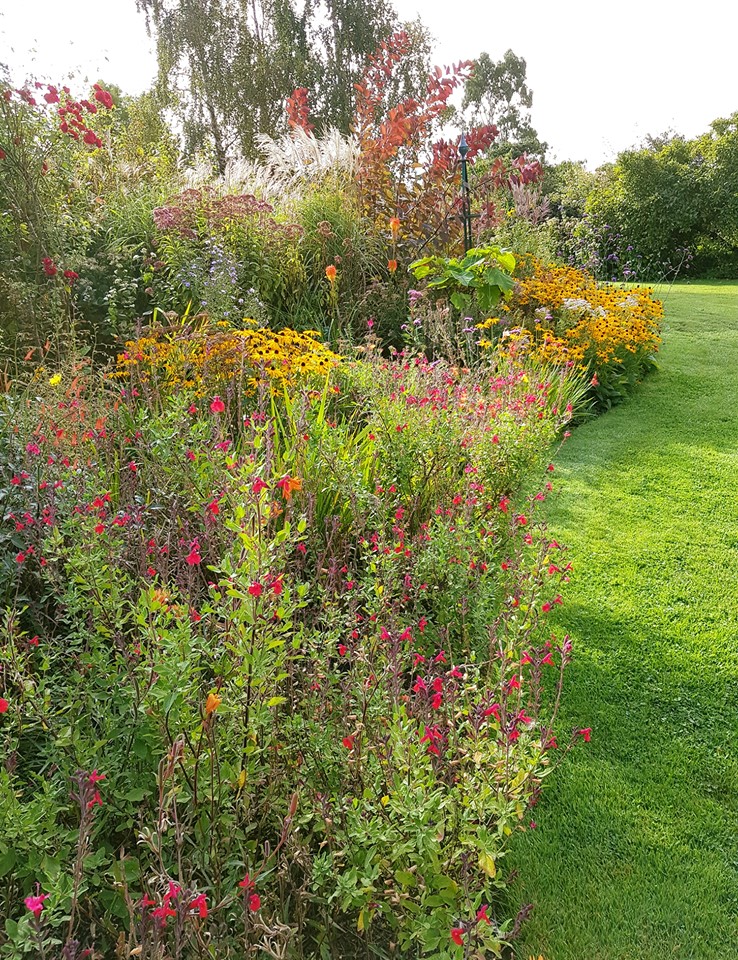 No obstante, se suele comentar que una de las mejores características de Merriments Gardens son las borduras curvas plantadas con una rica mezcla de árboles, arbustos, plantas vivaces, gramíneas ornamentales y muchas anuales inusuales, con esquemas que aseguran una exhibición deslumbrante de color y vitalidad hasta el otoño.
